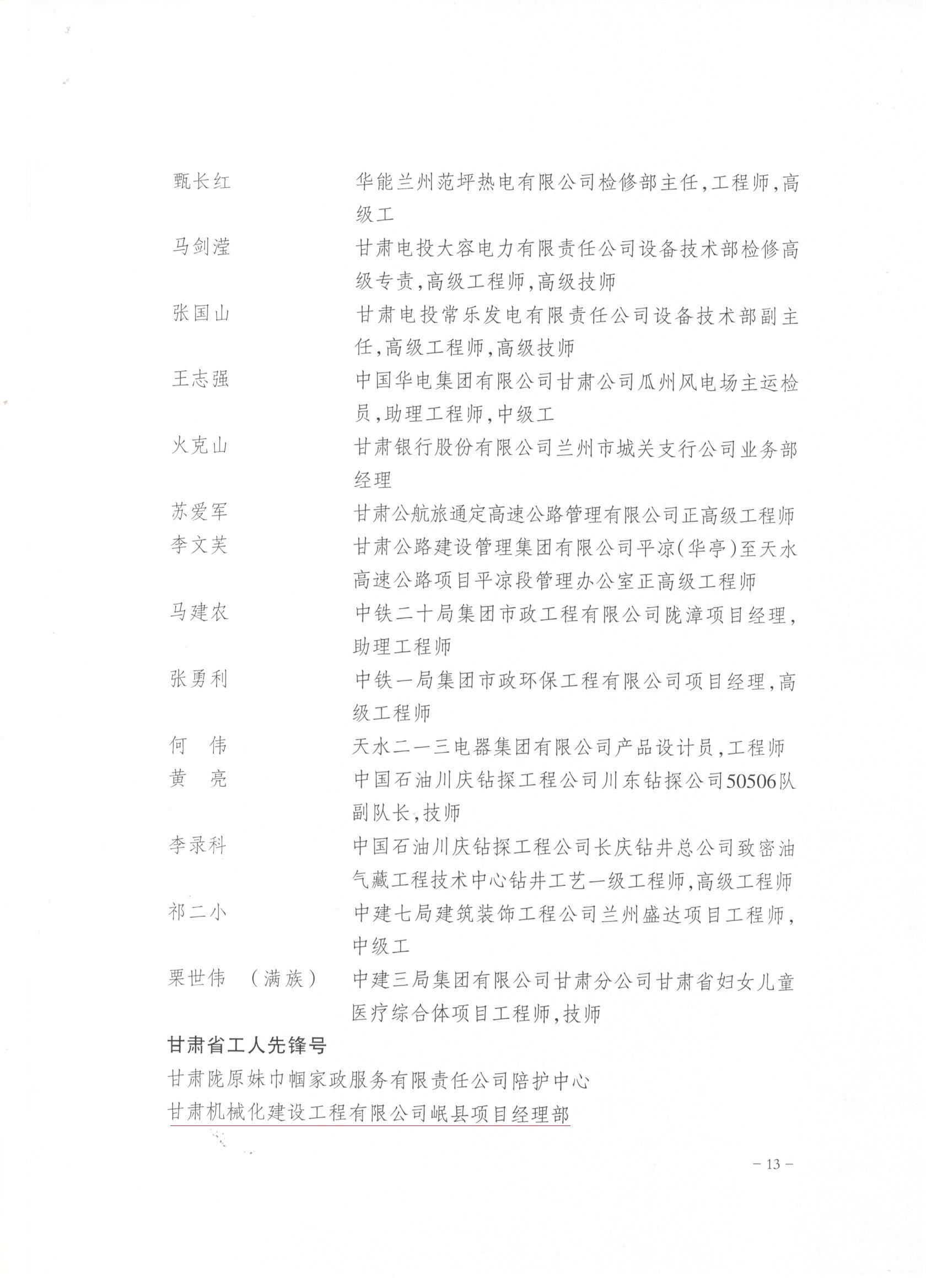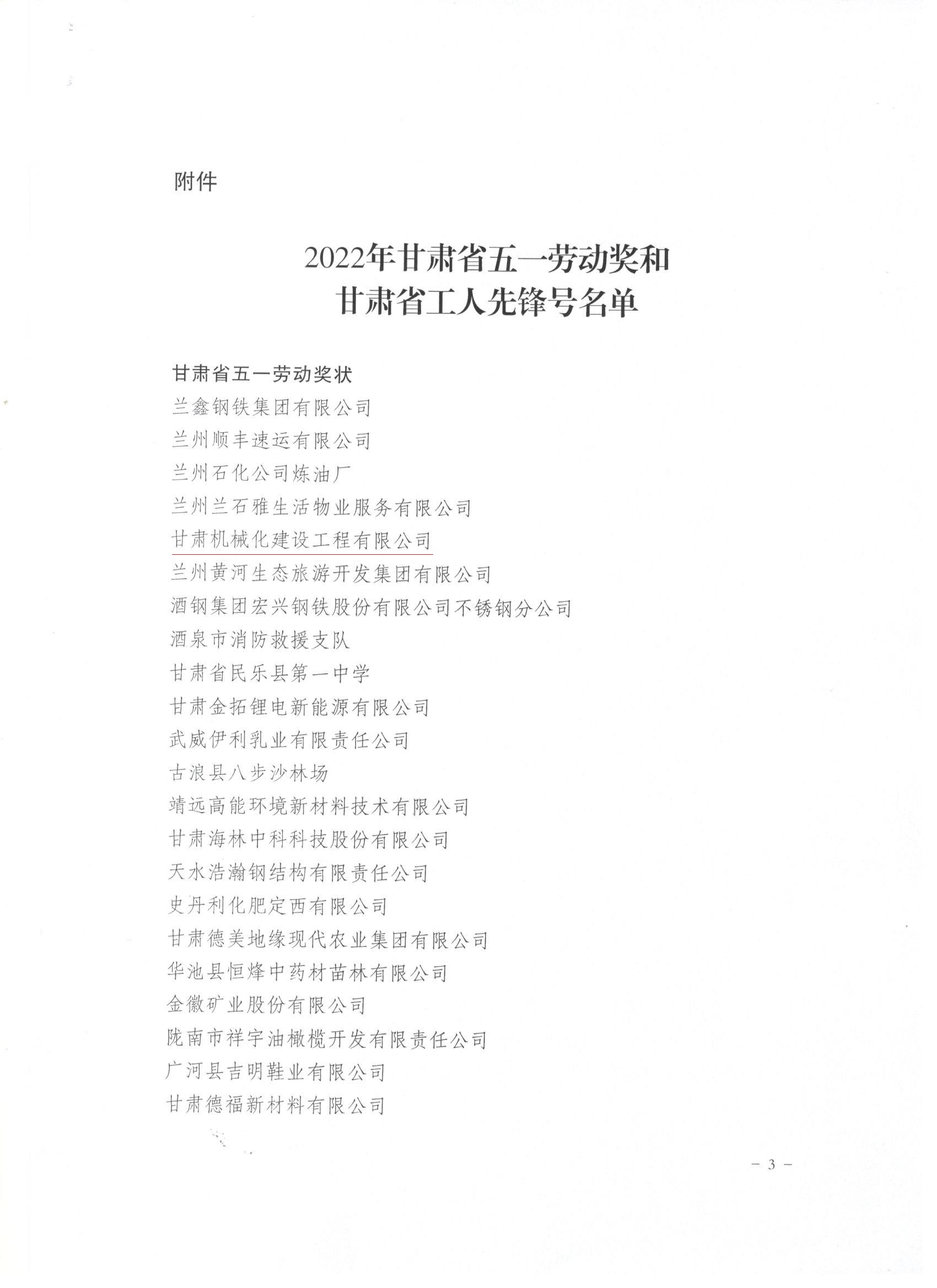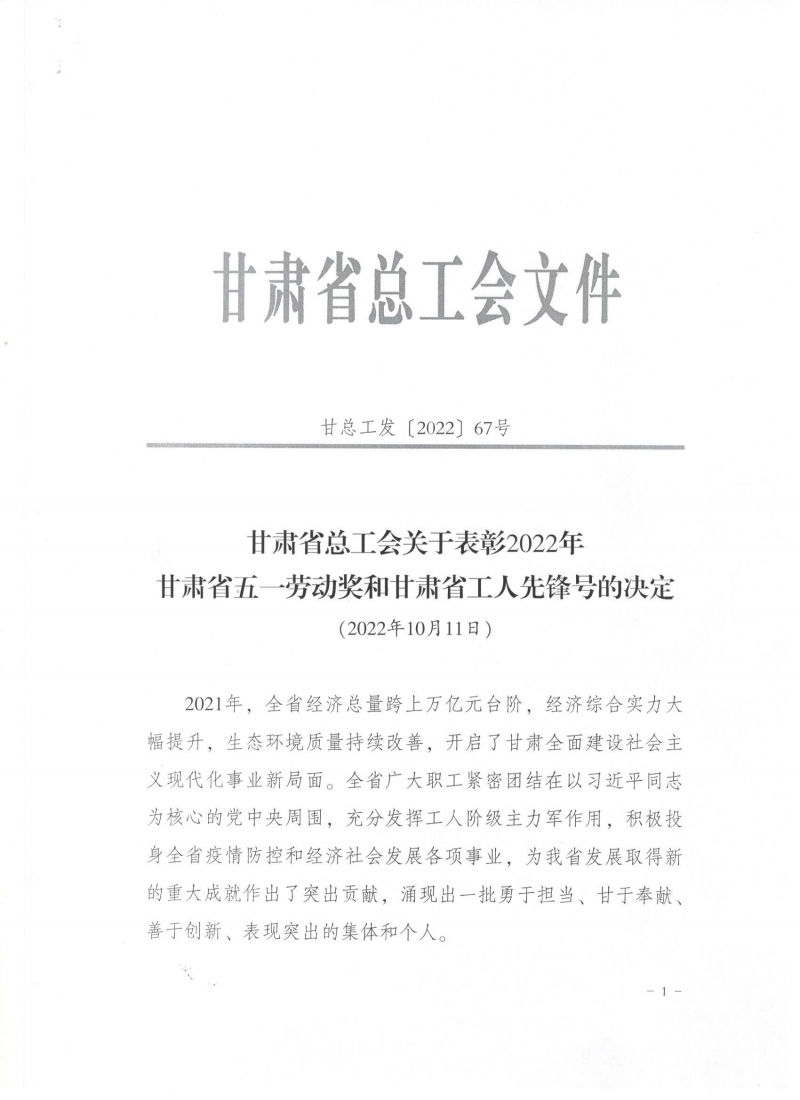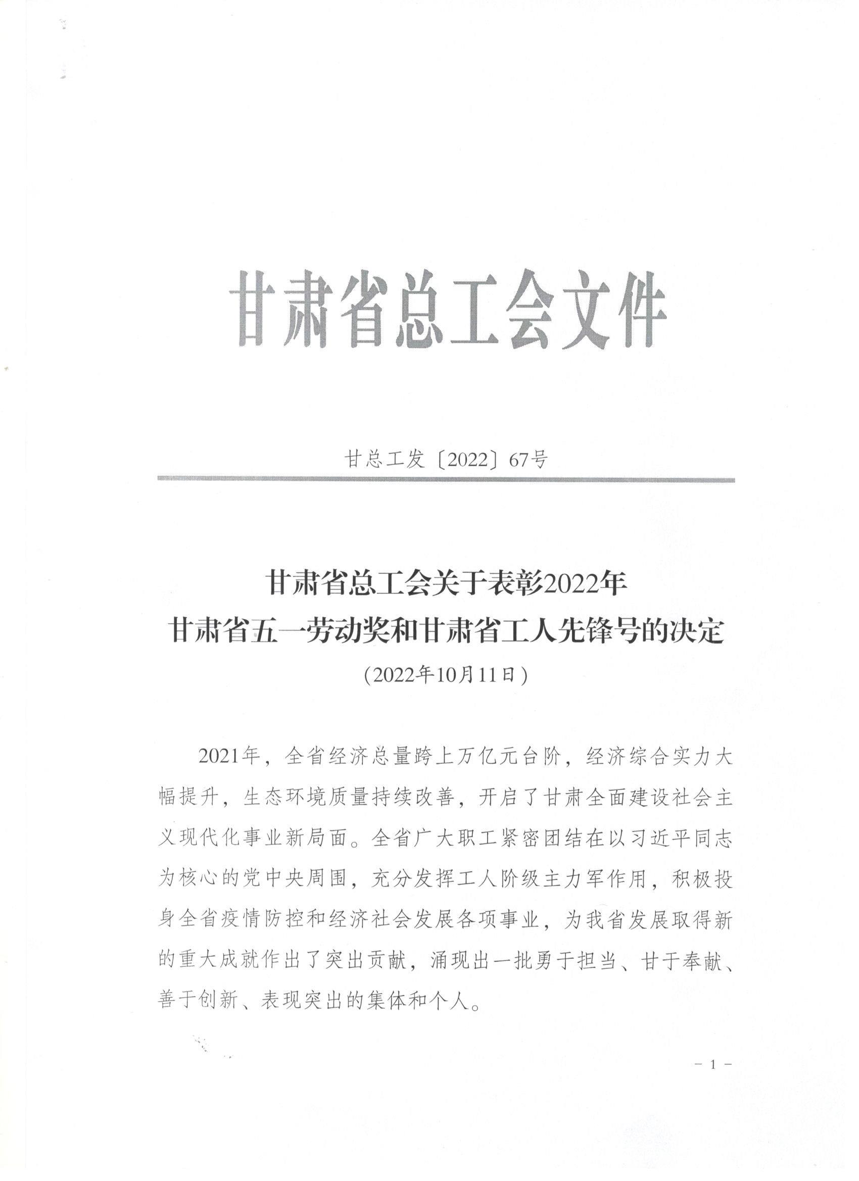 近日,甘肅省總工會發(fā)布了《關于表彰2022年甘肅省五一勞動獎和甘肅省工人先鋒號的決定》,我司被授予“甘肅省五一勞動獎”和“甘肅省工人先鋒號”。