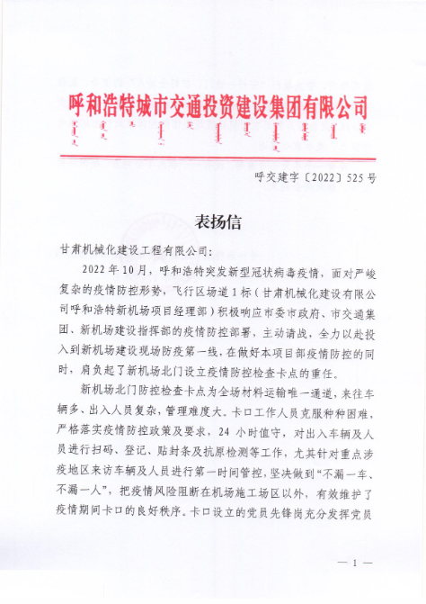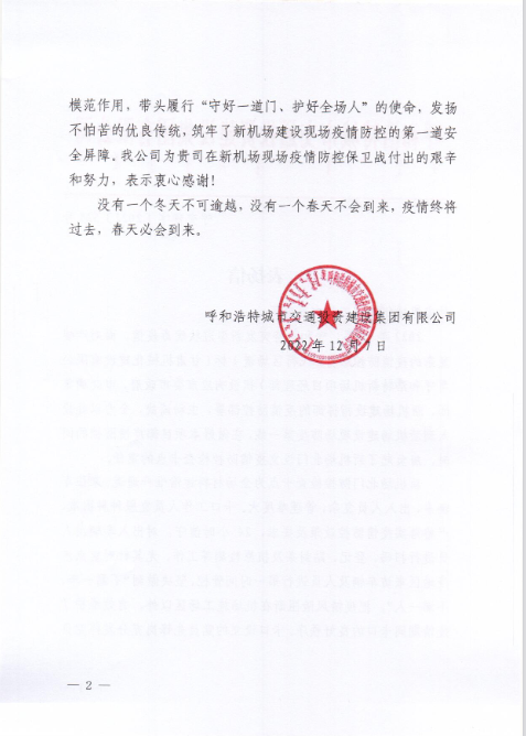 2022年12月7日,呼和浩特市交通投資建設(shè)集團(tuán)有限公司給我司發(fā)來表揚(yáng)信,表揚(yáng)信中充分肯定了我司呼和浩特新機(jī)場(chǎng)項(xiàng)目部在疫情防控工作上作出的努力,展現(xiàn)了我司的社會(huì)責(zé)任與擔(dān)當(dāng)。